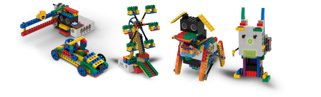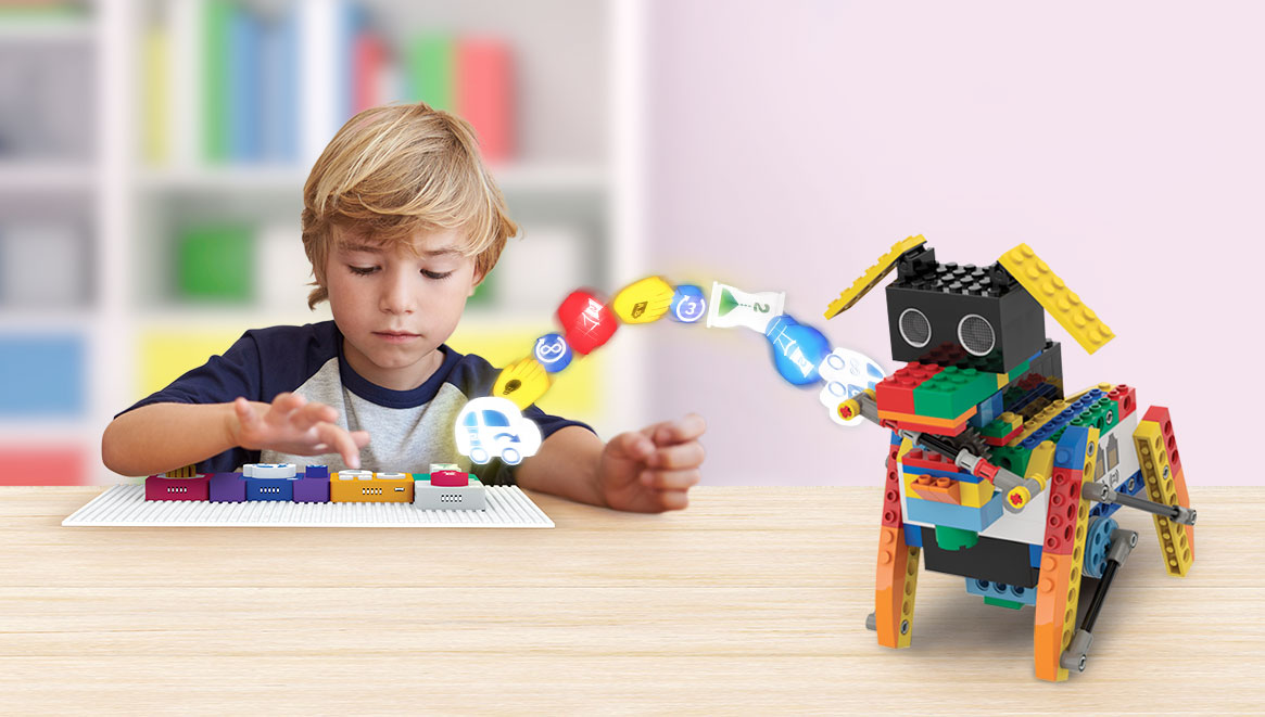 By matching function and parameter blocks together, the child creates a set of commands for the robot to perform. For example, moving it forward or turning on a red light.
